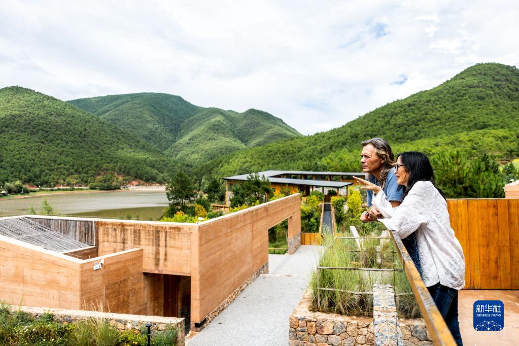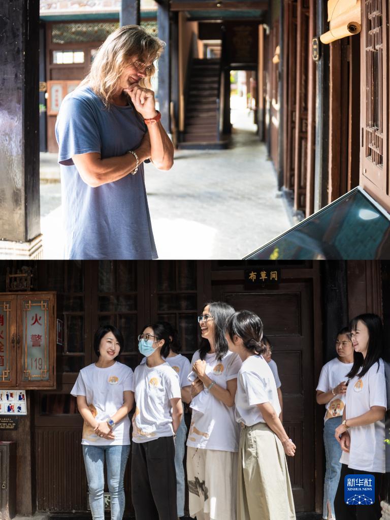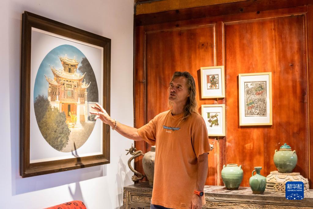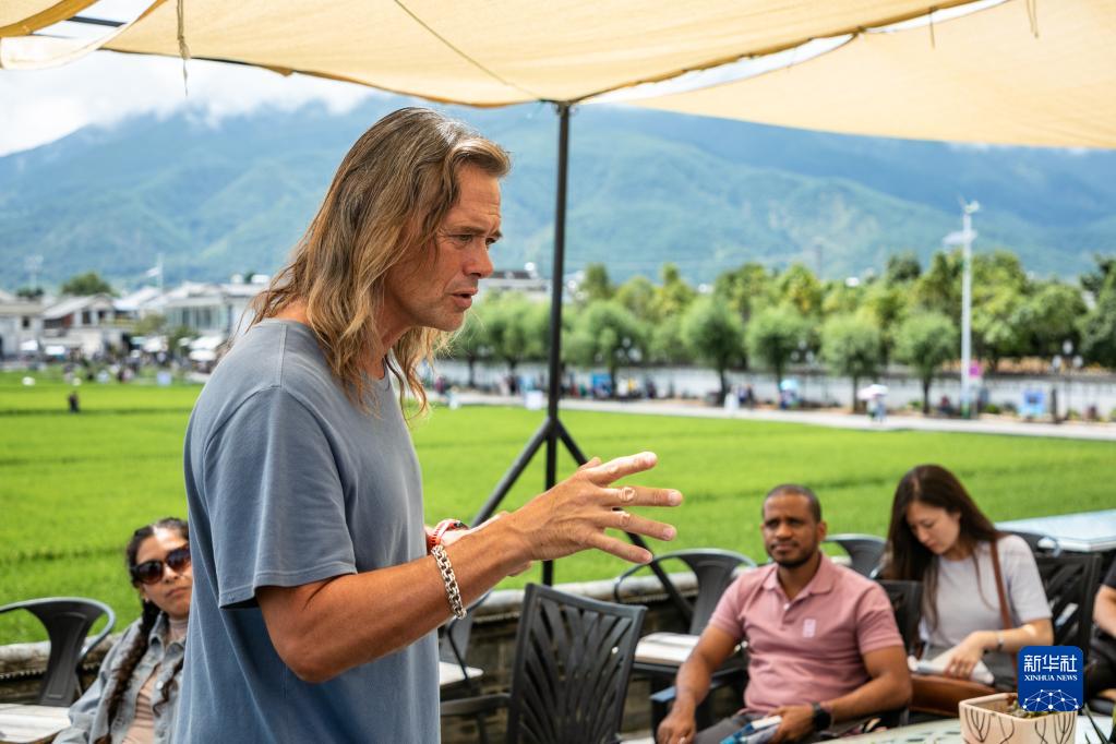 8月27日,林登在喜洲古鎮(zhèn)喜林苑向外國訪客介紹當?shù)匚幕?。新華社記者 曹夢瑤 攝