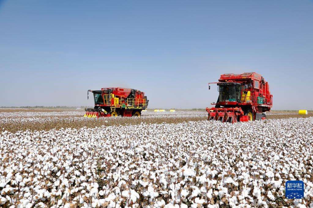 在新疆巴音郭楞蒙古自治州尉犁縣興平鎮(zhèn)統(tǒng)其克村,兩臺(tái)國(guó)產(chǎn)采棉機(jī)在采收棉花(2022年9月30日攝)。新華社發(fā)(汪志鵬 攝)