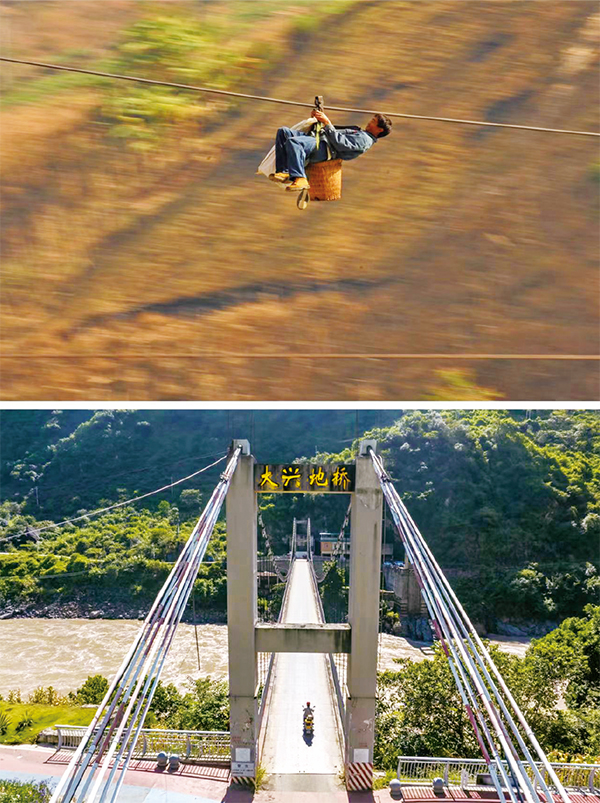 “過江靠溜索”曾是怒江兩岸群眾出行的重要方式。2013年,國家實施“溜索改橋”項目,幫助西部邊遠山區(qū)群眾結(jié)束溜索時代,怒江州怒江段上溜索被改造為各式跨江橋梁,完成了沿江人民“天塹變通途”的企盼。上圖為2013年2月2日,在云南省怒江州瀘水市六庫街道,一名居民背著背簍溜索過江(新華社記者 王長山/攝)。下圖為2022年9月13日,瀘水市居民騎摩托車通過大興地橋(無人機照片,新華社記者 江文耀/攝)。