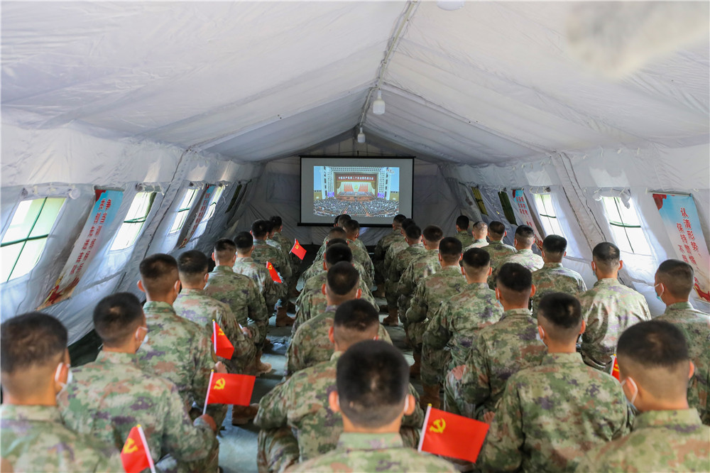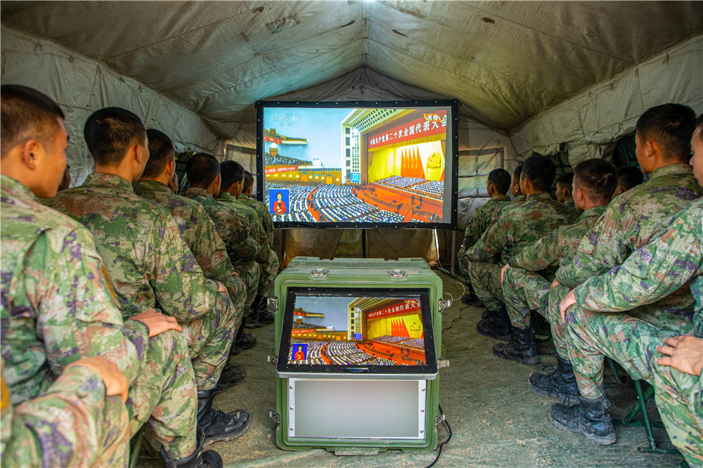 10月16日,中部戰(zhàn)區(qū)陸軍第82集團(tuán)軍某旅官兵收看中國(guó)共產(chǎn)黨第二十次全國(guó)代表大會(huì)開(kāi)幕會(huì)。新華社發(fā)(徐超 攝)