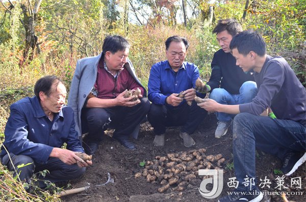 金秋十月,碩果累累。10月18日下午,在海拔1500多米,漫山紅遍、層林盡染的陜西省漢中市寧強(qiáng)縣陽平關(guān)鎮(zhèn)伍家壩村磨刀寨的山林里,寧強(qiáng)縣財(cái)政局派駐伍家壩村第一書記唐賢斌、寧強(qiáng)縣天麻研究所的專家張懷榮與天麻種植大戶朱清衛(wèi)、劉堂勇、成溫斌等人正在查看天麻的收成、準(zhǔn)備采挖豐收的天麻。