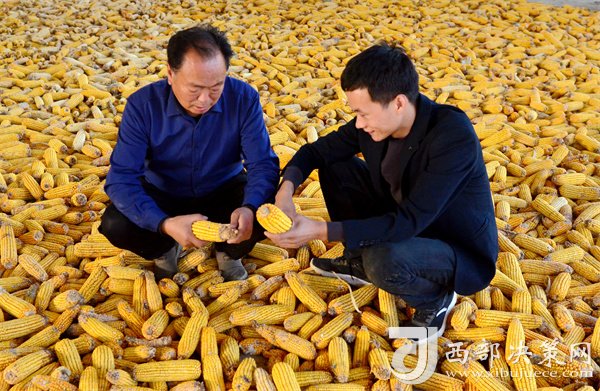 唐賢斌(左)正在查看村民收獲的玉米。