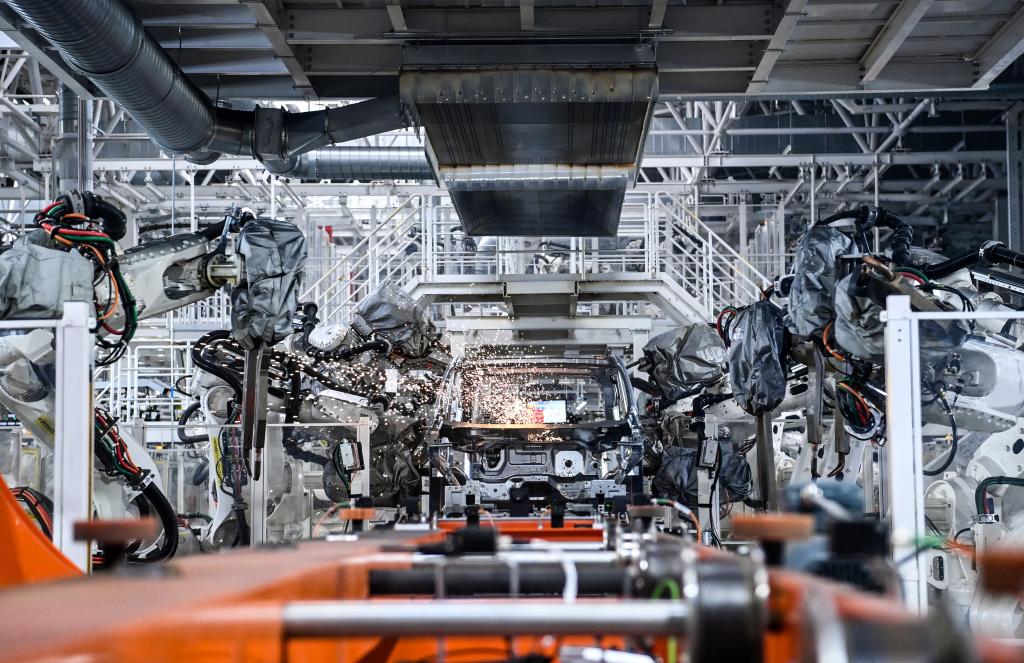 10月17日,在吉林長春中國第一汽車集團有限公司紅旗繁榮工廠焊裝車間內,焊裝機器人在生產線上焊接車身。新華社記者 顏麟蘊 攝