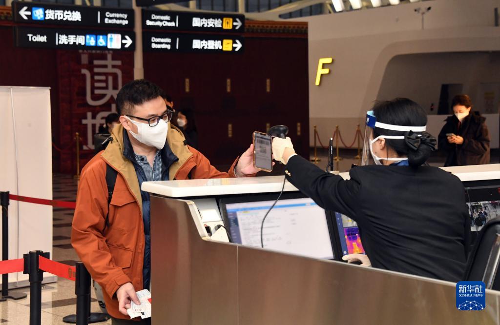 1月17日,在北京大興機場,海關關員核驗乘坐CZ309次北京飛往香港航班旅客的海關健康申報二維碼。新華社記者 任超 攝
