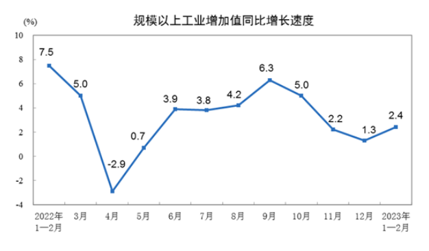 國(guó)家統(tǒng)計(jì)局3月15日發(fā)布數(shù)據(jù)顯示,今年前2個(gè)月,全國(guó)規(guī)模以上工業(yè)增加值同比增長(zhǎng)2.4%,比2022年12月份加快1.1個(gè)百分點(diǎn);兩年平均增長(zhǎng)4.9%。