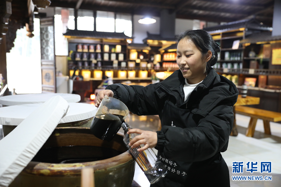 工作人員為顧客打散裝曬醋。新華網(wǎng) 周遠鋼 攝