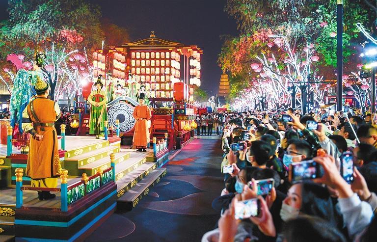 文化為旅游賦能,旅游因文化而有了靈魂。如果說大唐不夜城是西安盛唐文化的名片,那么大唐不夜城的演出則把盛唐文化真切地呈現(xiàn)在了人們的面前?!赌奚延鹨挛琛肥鞘⑻谱钊A麗的舞蹈,《花車斗彩》展示了大唐風(fēng)采,《盛唐密盒》把生活過成了段子,《華燈太白》凝結(jié)了李白的詩情與不羈,“不倒翁小姐姐”巧笑倩兮,搖出了長安女子的溫柔……
