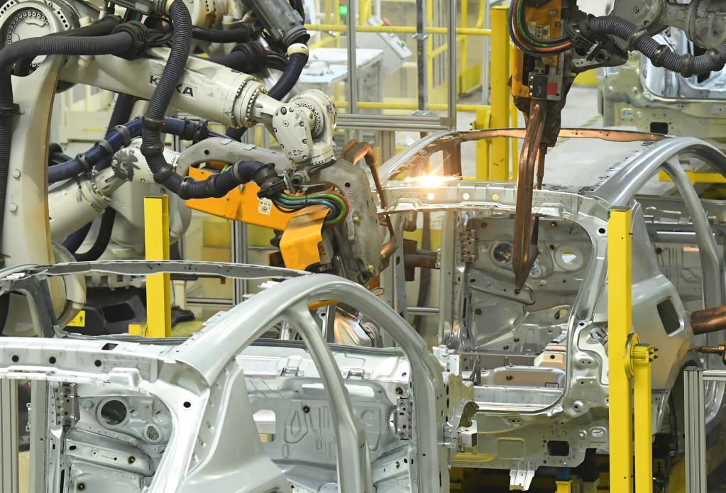 4月11日,智能機器人在領(lǐng)克汽車寧波余姚工廠焊裝車間工作。新華社記者翁忻旸 攝