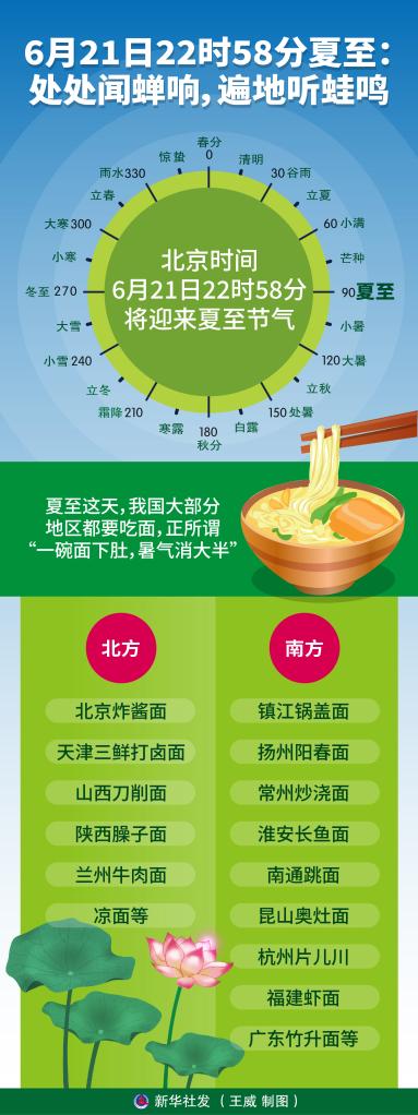 新華社天津6月20日電(記者周潤?。?ldquo;綠筠尚含粉,圓荷始散芳”。北京時間6月21日22時58分將迎來夏至節(jié)氣,標(biāo)志著蛙鳴陣陣、蟬吟聲聲、荷韻飄香的盛夏來臨了。