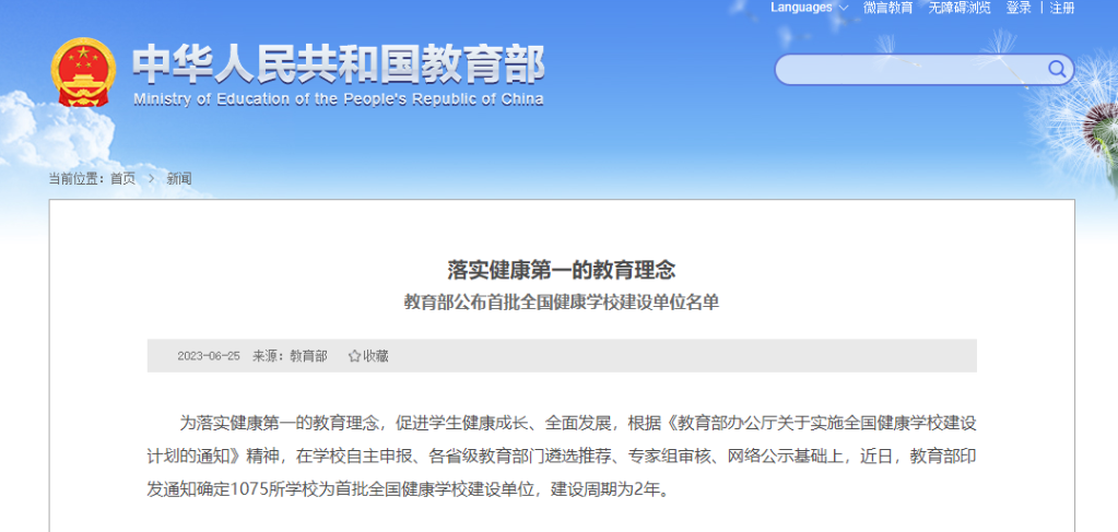記者6月25日從教育部獲悉,為落實(shí)健康第一的教育理念,促進(jìn)學(xué)生健康成長(zhǎng)、全面發(fā)展,在學(xué)校自主申報(bào)、各省級(jí)教育部門遴選推薦、專家組審核、網(wǎng)絡(luò)公示基礎(chǔ)上,教育部近日印發(fā)通知,確定1075所學(xué)校為首批全國健康學(xué)校建設(shè)單位,建設(shè)周期為2年。