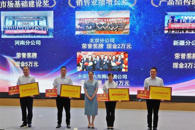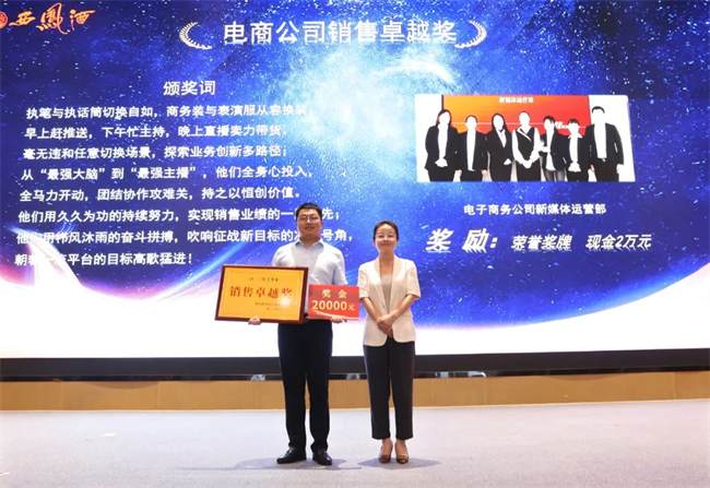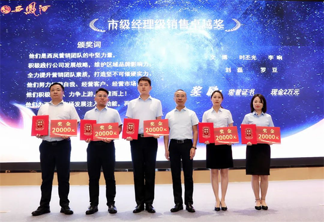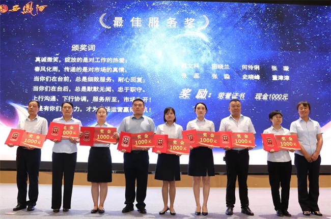 西鳳股份公司總經(jīng)理助理趙永紅為市級(jí)經(jīng)理銷售卓越獎(jiǎng)獲得者頒發(fā)榮譽(yù)證書(shū)與獎(jiǎng)金