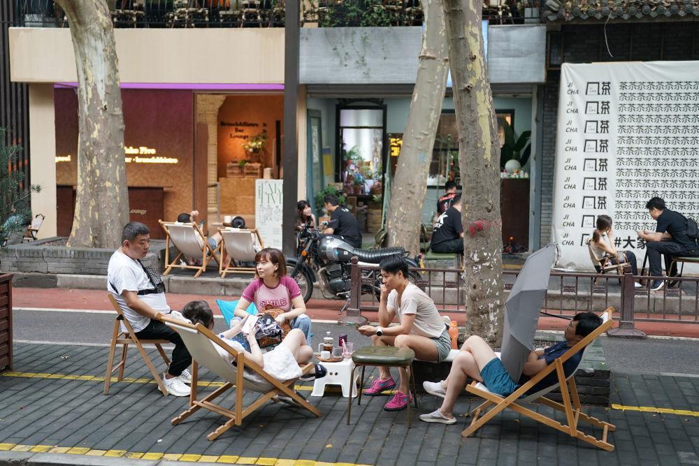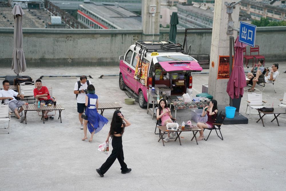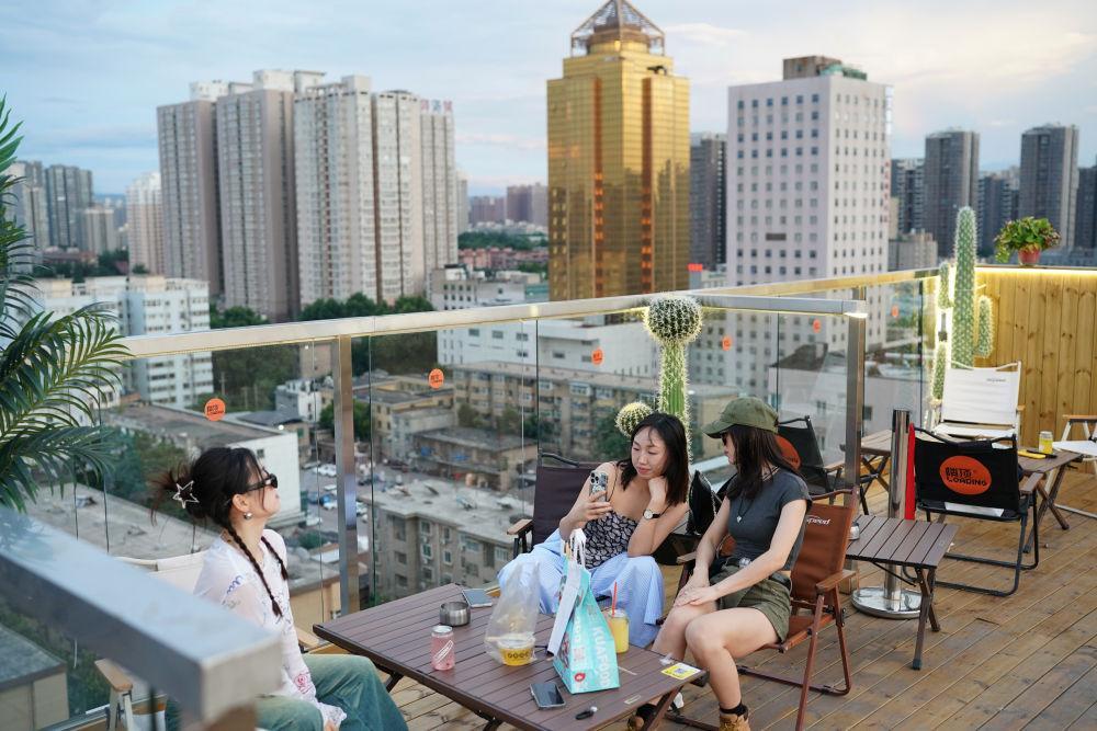 7月26日,年輕人在一棟由停車樓頂層改造而來的飲品店內(nèi)消費休閑。新華社記者 邵瑞 攝