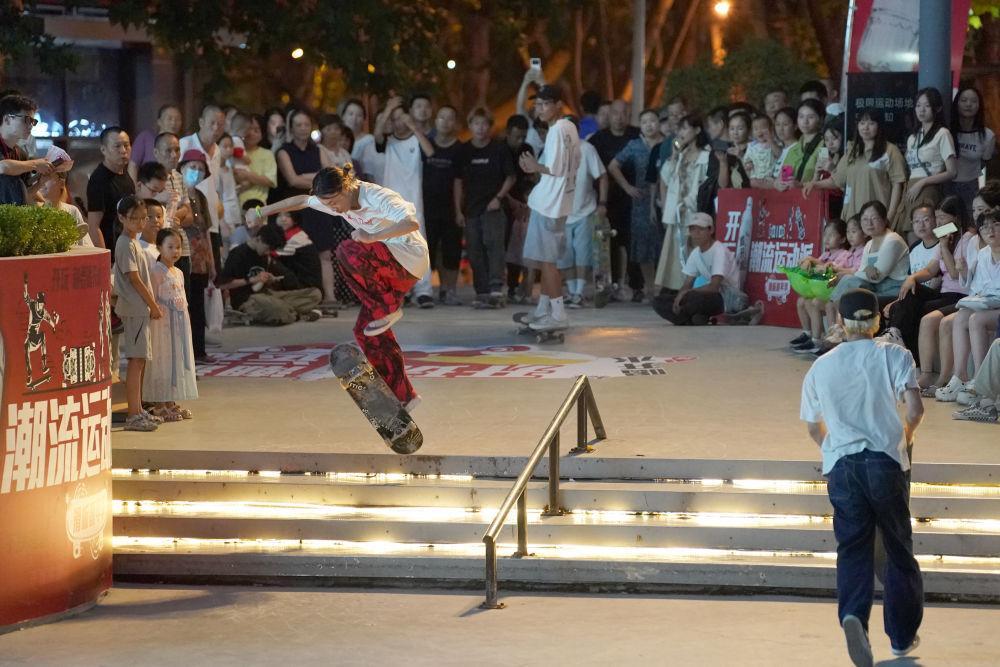 7月30日,滑板愛好者在西安市一商業(yè)街區(qū)進行滑板表演有獎競賽活動。新華社記者 邵瑞 攝