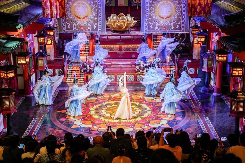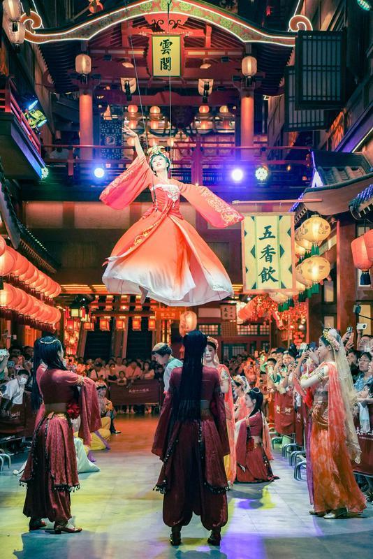 精彩的舞蹈吸引了游客的目光,將他們帶回盛唐街頭。