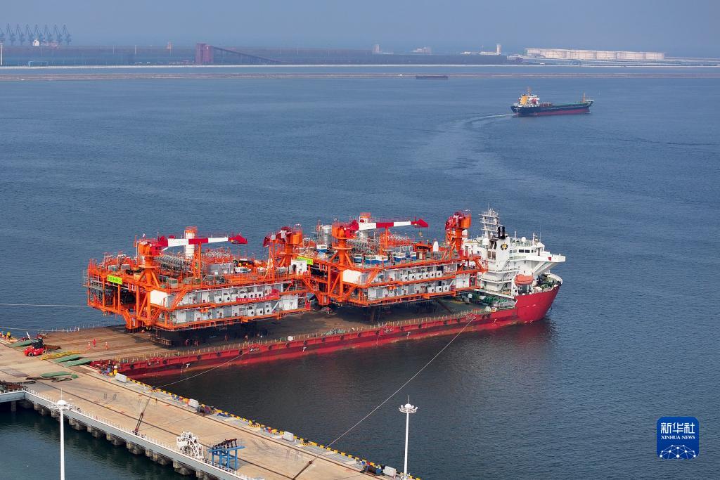 這是8月9日在天津濱海新區(qū)拍攝的渤中19-6凝析氣田I期開發(fā)項目組塊裝船作業(yè)現(xiàn)場(無人機照片)。組塊裝船后將赴渤海西部海域,進(jìn)入海上安裝和聯(lián)調(diào)階段。新華社發(fā)(杜鵬輝攝)