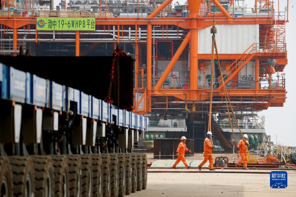 8月9日,在天津濱海新區(qū)海油工程智能化制造基地,工人進(jìn)行組塊裝船前的準(zhǔn)備工作。新華社發(fā)(杜鵬輝攝)