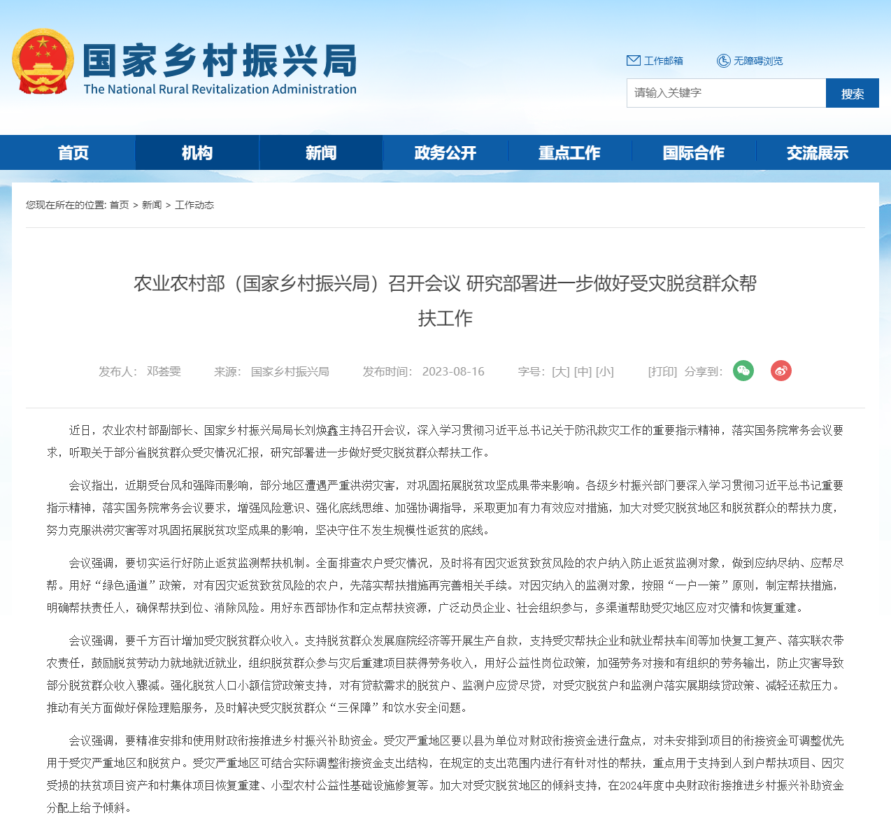 央視網(wǎng)消息:近日,農(nóng)業(yè)農(nóng)村部(國家鄉(xiāng)村振興局)召開會議,要求各級鄉(xiāng)村振興部門加大對受災脫貧地區(qū)和脫貧群眾的幫扶力度,努力克服洪澇災害等對鞏固拓展脫貧攻堅成果的影響,堅決守住不發(fā)生規(guī)模性返貧的底線。