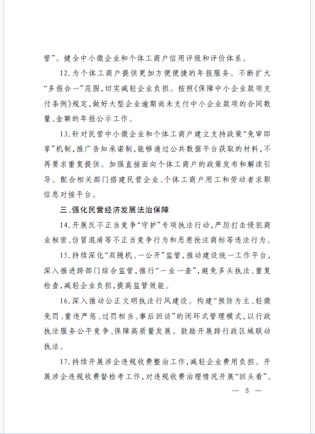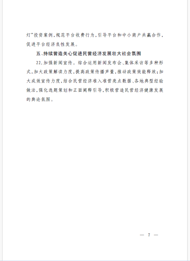 22條舉措聚焦五個(gè)方面,落實(shí)《意見》部署要求,回應(yīng)了民營經(jīng)濟(jì)各類關(guān)切:一是持續(xù)優(yōu)化民營經(jīng)濟(jì)發(fā)展環(huán)境。持續(xù)破除市場(chǎng)準(zhǔn)入壁壘,全面落實(shí)公平競(jìng)爭(zhēng)政策制度,強(qiáng)化制止濫用行政權(quán)力排除、限制競(jìng)爭(zhēng)的反壟斷執(zhí)法,完善社會(huì)信用激勵(lì)約束機(jī)制,健全失信行為糾正后的信用修復(fù)機(jī)制。二是加大對(duì)民營經(jīng)濟(jì)政策支持力度。完善信用信息歸集共享,健全中小微企業(yè)和個(gè)體工商戶信用評(píng)級(jí)和評(píng)價(jià)體系。完善支持政策直達(dá)快享機(jī)制。三是強(qiáng)化民營經(jīng)濟(jì)發(fā)展法治保障。持續(xù)完善知識(shí)產(chǎn)權(quán)保護(hù)體系,完善監(jiān)管執(zhí)法體系,杜絕選擇性執(zhí)法,健全涉企收費(fèi)長(zhǎng)效監(jiān)管機(jī)制。四是著力推動(dòng)民營經(jīng)濟(jì)實(shí)現(xiàn)高質(zhì)量發(fā)展。支持民營企業(yè)參與標(biāo)準(zhǔn)制定,計(jì)量服務(wù)中小企業(yè)。依法規(guī)范和引導(dǎo)民營資本健康發(fā)展,推動(dòng)平臺(tái)經(jīng)濟(jì)健康發(fā)展。五是持續(xù)營造關(guān)心促進(jìn)民營經(jīng)濟(jì)發(fā)展壯大社會(huì)氛圍,及時(shí)推廣經(jīng)驗(yàn)做法,加大宣傳。
