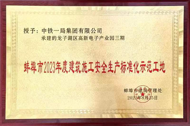 近日,中鐵一局蚌埠龍子湖區(qū)高新電子產業(yè)園EPC三期項目收到蚌埠市建筑管理處授予的“蚌埠市2023年度建筑施工安全生產標準示范化工地”榮譽匾。