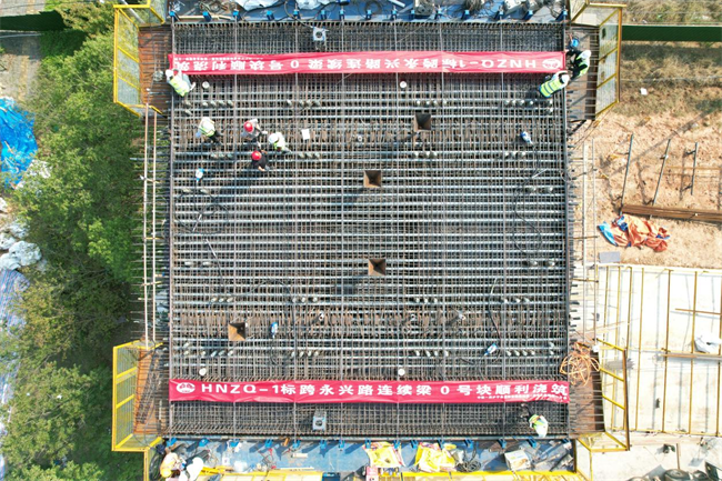 跨京滬高鐵立交特大橋位于滁河西岸,安徽省滁州市南譙區(qū)烏衣鎮(zhèn)和全椒縣十字鎮(zhèn)境內(nèi),總長(zhǎng)17.5公里。其中跨永興路連續(xù)梁為三跨變截面箱梁,跨越滁州市南讓區(qū)永興路,橋跨位置對(duì)應(yīng)跨京滬高鐵立交特大橋180#墩至183#墩,全長(zhǎng)177.7米,0#塊長(zhǎng)度達(dá)12米。由于0#段內(nèi)預(yù)應(yīng)力筋布置復(fù)雜、非預(yù)應(yīng)力筋密集,要求一次澆筑成型,施工難度大。為保證施工質(zhì)量,此次澆筑總體以“統(tǒng)籌規(guī)劃、科學(xué)組織、重點(diǎn)先行、分段展開(kāi)、均衡生產(chǎn)、標(biāo)準(zhǔn)化作業(yè)、有序推進(jìn)”為原則展開(kāi)施工。