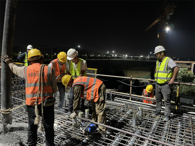 整個(gè)澆筑自10月15日下午4點(diǎn)44分開(kāi)始,至10月16日早上7點(diǎn)30分結(jié)束,共用時(shí)14.77小時(shí),本次澆筑采用泵送加下料管入模、附著式平板振動(dòng)器加插入式振動(dòng)器相結(jié)合的施工工藝,澆筑混凝土共計(jì)305方。此次澆筑為后續(xù)連續(xù)梁施工奠定了良好的基礎(chǔ),標(biāo)志著跨京滬高鐵立交特大橋施工正式進(jìn)入控制性工程。
