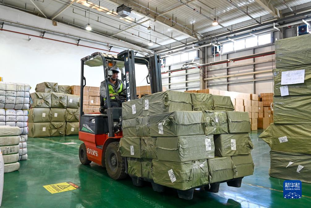 工作人員在新疆喀什綜合保稅區(qū)內(nèi)的中順電子跨境電商貨物分揀中心轉(zhuǎn)運(yùn)出口的貨物(11月4日攝)。