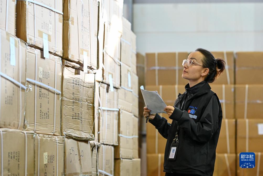 庫管員在新疆喀什綜合保稅區(qū)內(nèi)的中順電子跨境電商貨物分揀中心核對出口的貨物(11月4日攝)。