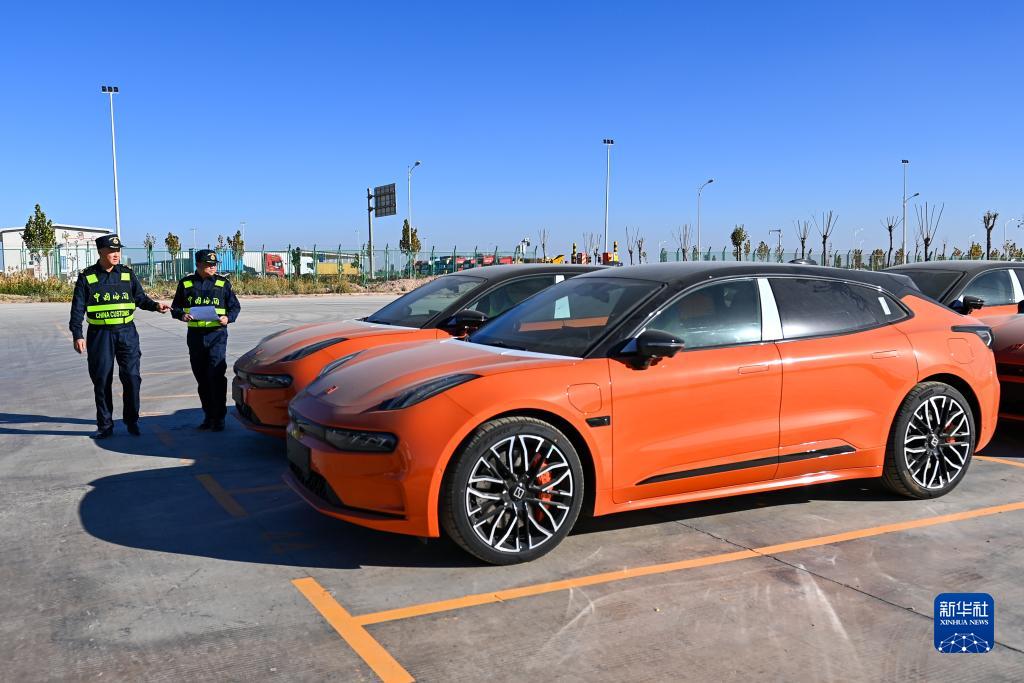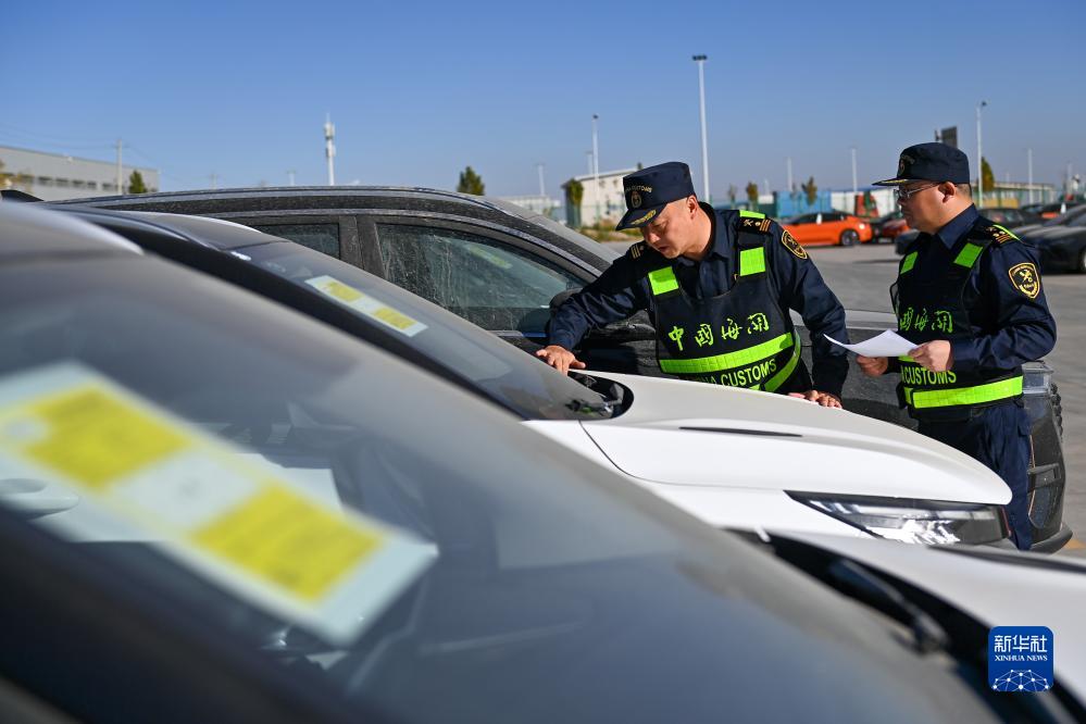 海關(guān)關(guān)員在新疆喀什綜合保稅區(qū)內(nèi)的海關(guān)施封集中查驗(yàn)作業(yè)區(qū)查驗(yàn)出口商品車(11月4日攝)。
