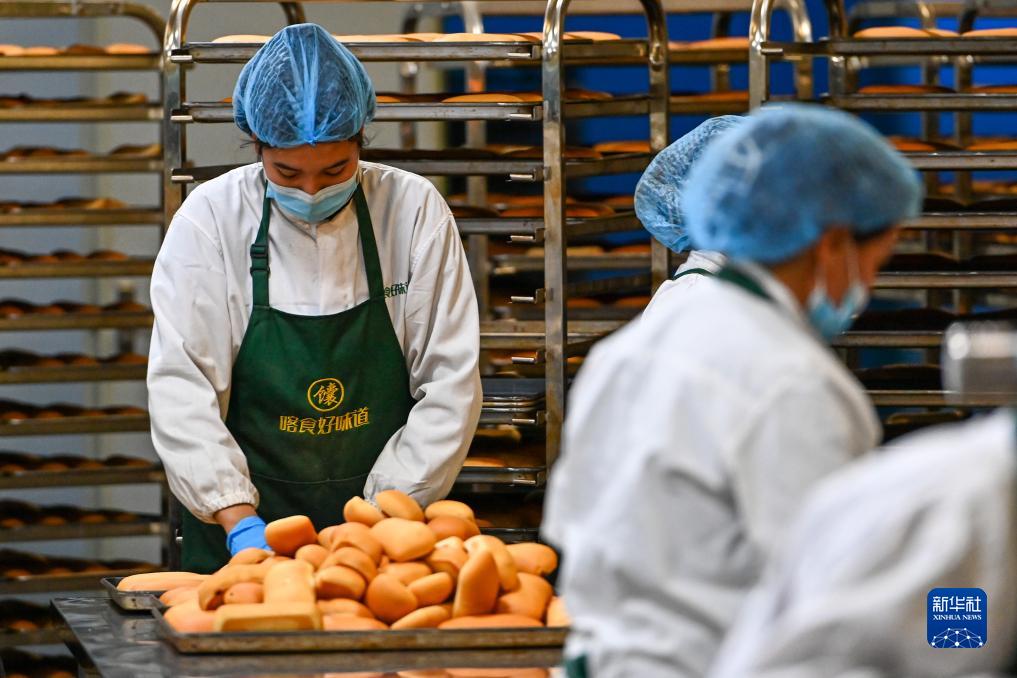 工作人員在新疆喀什綜合保稅區(qū)內(nèi)的新疆疆來美農(nóng)業(yè)科技有限公司分揀剛做好的糕點(diǎn)(11月4日攝)。