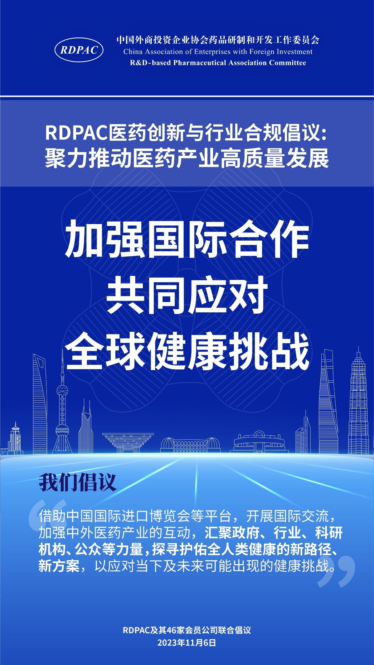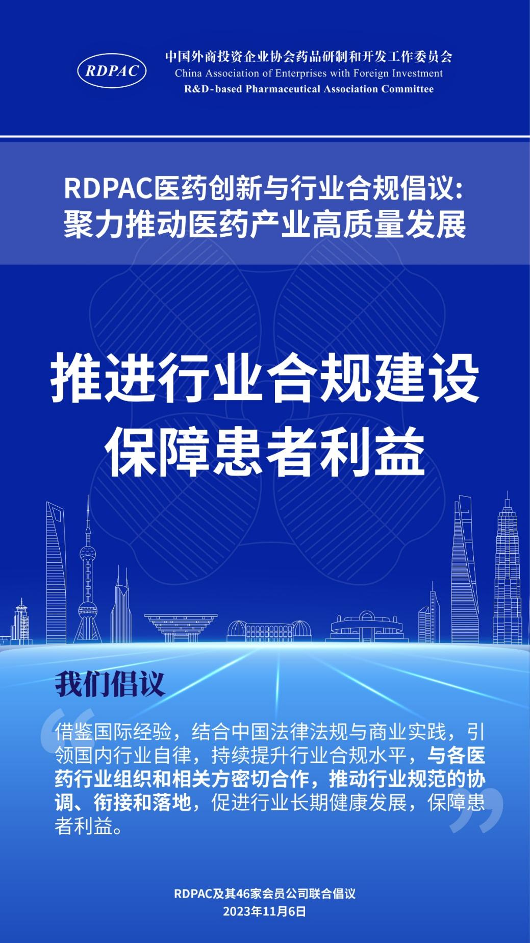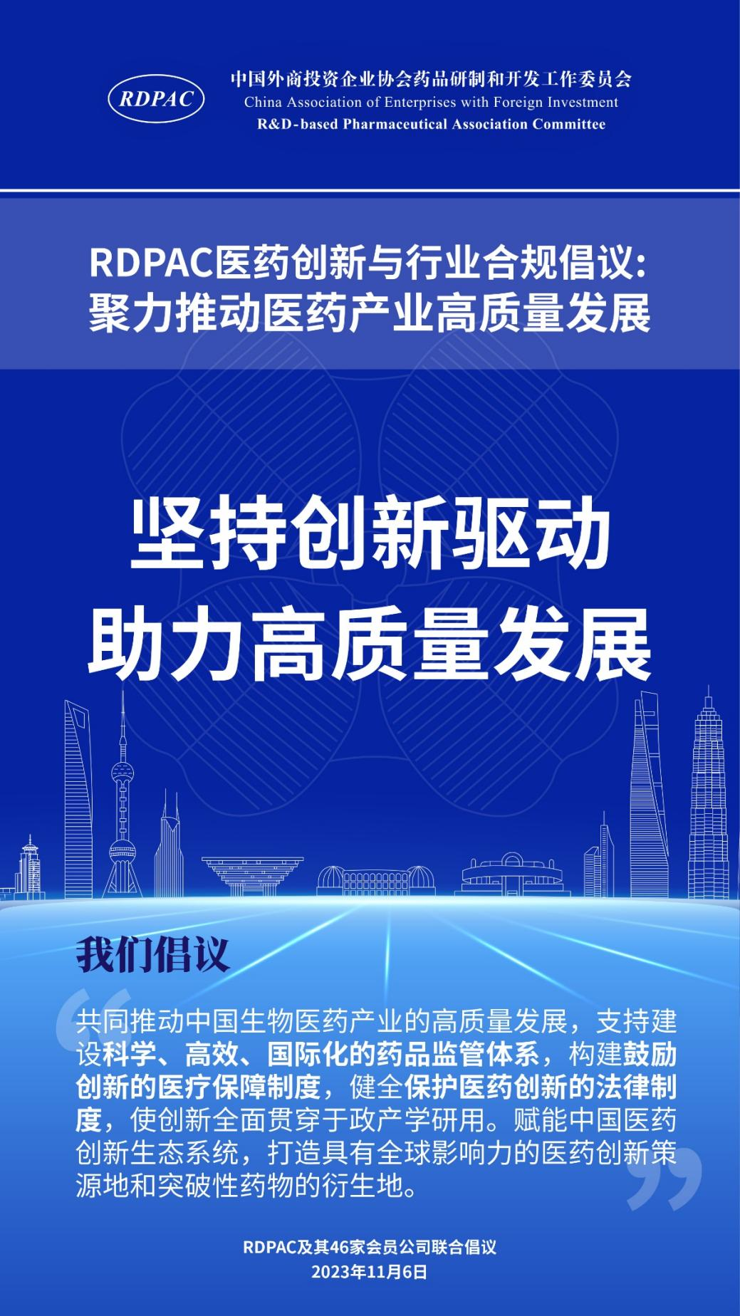 11月6日,中國外商投資企業(yè)協(xié)會藥品研制和開發(fā)工作委員會 (以下簡稱 “RDPAC”)及其成員公司在華負責(zé)人共同發(fā)起“RDPAC醫(yī)藥創(chuàng)新與行業(yè)合規(guī)倡議”,致力于打造充滿活力的醫(yī)藥創(chuàng)新生態(tài)系統(tǒng)、完善的行業(yè)合規(guī)體系,聚力推動中國醫(yī)藥產(chǎn)業(yè)的高質(zhì)量發(fā)展,建設(shè)健康中國。