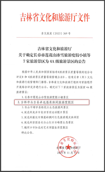 近日, 根據(jù)國家《旅游景區(qū)質(zhì)量等級(jí)的劃分與評(píng)定》和《旅游景區(qū)質(zhì)量等級(jí)管理辦法》,經(jīng)相關(guān)部門推薦,吉林省文化和旅游廳組織專家按程序開展綜合評(píng)定并進(jìn)行公示,確定金恪集團(tuán)旗下吉林卓遠(yuǎn)溫泉休閑旅游度假區(qū)等7家旅游景區(qū)成為國家4A級(jí)旅游景區(qū)。