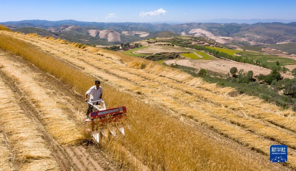 近日,寧夏西海固地區(qū)種植的冬小麥陸續(xù)進入收割季節(jié)。旱塬、梯田上一片金黃,農(nóng)民操作著收割機械在其中忙碌。據(jù)了解,今年固原市夏糧面積42.89萬畝,其中冬小麥36.04萬畝。