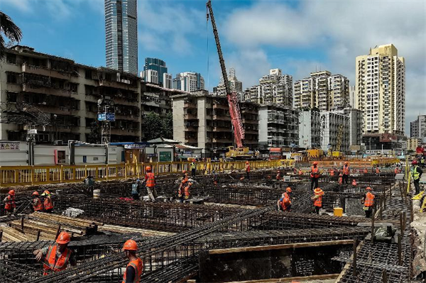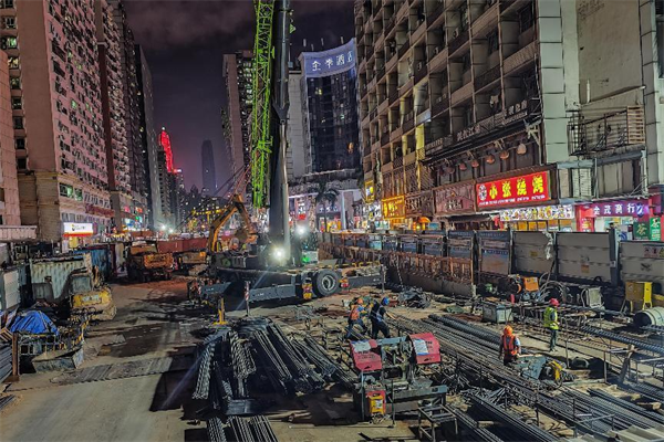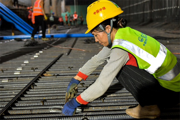 在1號(hào)工點(diǎn)的第3層基坑里,東邊,10幾名穿著印有工種名稱(chēng)的反光馬甲的工人正忙著安裝模板鋼支撐;西邊,20幾名同樣穿著馬甲的工人,或綁扎鋼筋,或轉(zhuǎn)運(yùn)鋼筋,或焊接鋼筋……一派忙而有序的大干場(chǎng)面。在3號(hào)工點(diǎn)地面,華燈初上,1臺(tái)吊車(chē),4、5名鋼筋工、電焊工也在忙個(gè)不停……