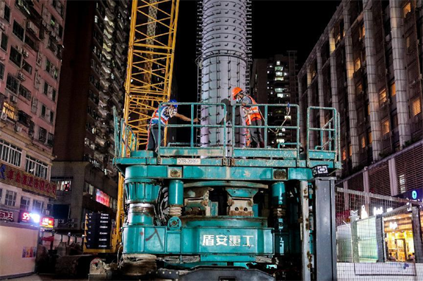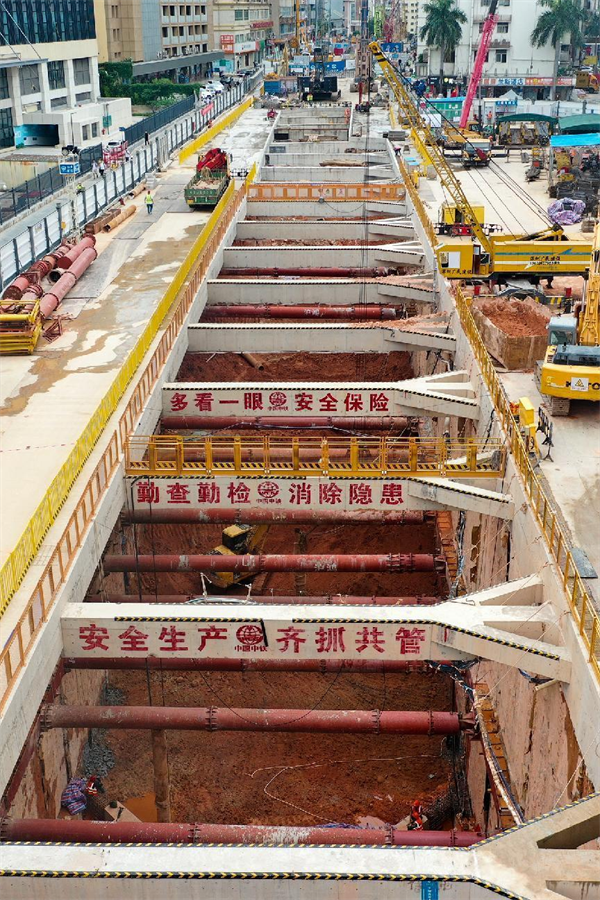 在鋼管立柱施工時(shí),遇見(jiàn)一條10千伏電力管線(xiàn),空隙僅僅只有10厘米;還有一道污水管距離50厘米。為保護(hù)好管線(xiàn),施工時(shí)管理人員現(xiàn)場(chǎng)全程指揮協(xié)調(diào),防止異常情況出現(xiàn)以便能及時(shí)協(xié)調(diào)解決,使鉆孔設(shè)備在小心翼翼地轉(zhuǎn)動(dòng)中安全順利完成了鋼管立柱插入施工。2022年10月10日,隨著最后一根26米長(zhǎng)的鋼管立柱緩緩吊裝、精準(zhǔn)插入鉆孔中,中大八院站蓋挖鋼管立柱全部完成施工。至此,項(xiàng)目部高風(fēng)險(xiǎn)大型起重吊裝施工全部完成、高噪音設(shè)備全部退場(chǎng),中大八院站全面進(jìn)入深基坑開(kāi)挖及主體施工階段。項(xiàng)目部經(jīng)受住了第二波考驗(yàn)。