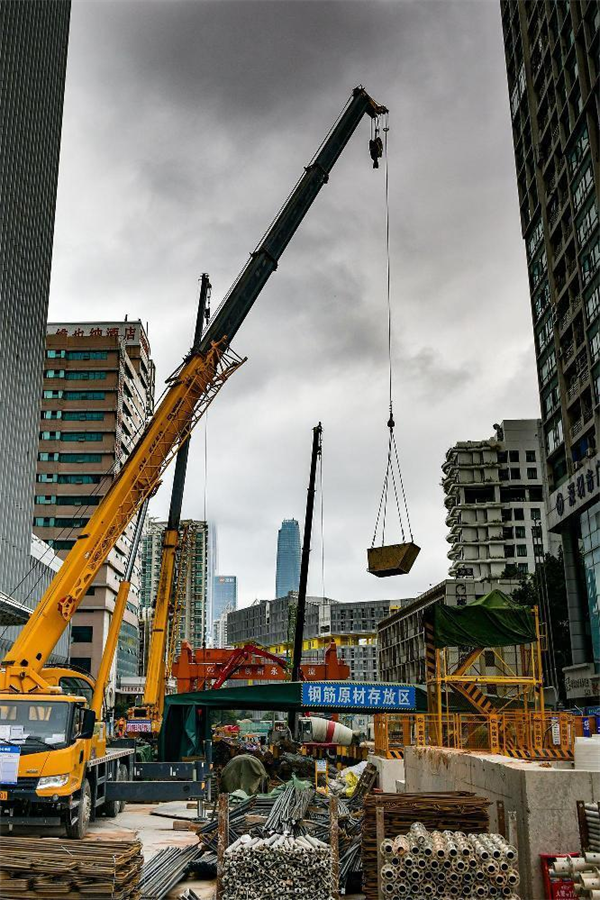 我們?cè)谧鳛楫?dāng)下施工主戰(zhàn)場(chǎng)的2號(hào)工點(diǎn)地面東邊施工現(xiàn)場(chǎng)看到,沒(méi)有明顯標(biāo)識(shí)卻能一眼分辨的“迷你”鋼筋加工場(chǎng)里,7、8名穿著“鋼筋工”馬甲的工人,或給鋼筋套絲,或彎制鋼筋構(gòu)件,或忙著調(diào)運(yùn)鋼筋捆……忙而不亂;在西邊,一臺(tái)抓斗機(jī)把土方從基坑里提出來(lái)放入旁邊的鐵鐵質(zhì)料斗箱里,一臺(tái)挖掘機(jī)又將箱里的土轉(zhuǎn)倒裝在運(yùn)土車(chē)?yán)铮裂b滿(mǎn)后鏟斗又將土壓實(shí)、將車(chē)幫上緣的土刮干凈,防止土在運(yùn)輸中掉落……