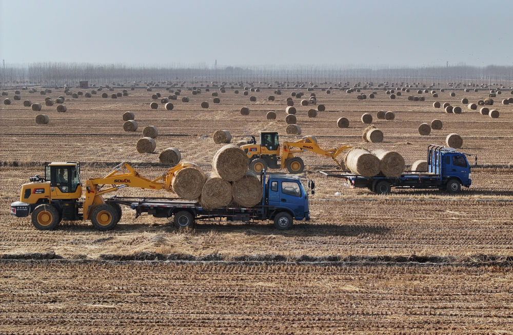 ↑河北省唐山市曹妃甸區(qū)第八農(nóng)場(chǎng)田間,稻草回收企業(yè)的工人將打好捆的稻草裝車(無(wú)人機(jī)照片,12月10日攝)。曹妃甸區(qū)通過(guò)將稻草集中收集用于生物質(zhì)發(fā)電、牲畜飼料和有機(jī)肥生產(chǎn),有效提高了秸稈綜合利用率。