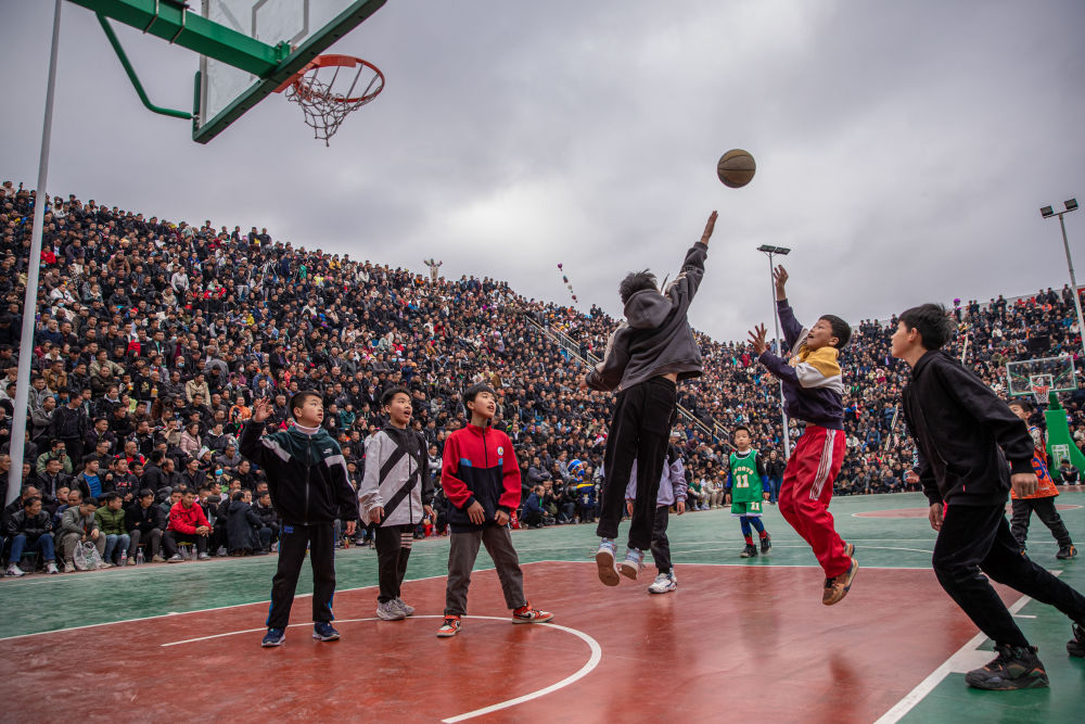 ↑貴州省黔東南州臺(tái)江縣臺(tái)盤村的小朋友在比賽前打籃球(3月25日攝)。當(dāng)日,貴州省首屆“美麗鄉(xiāng)村”籃球聯(lián)賽總決賽在臺(tái)盤村開(kāi)打。