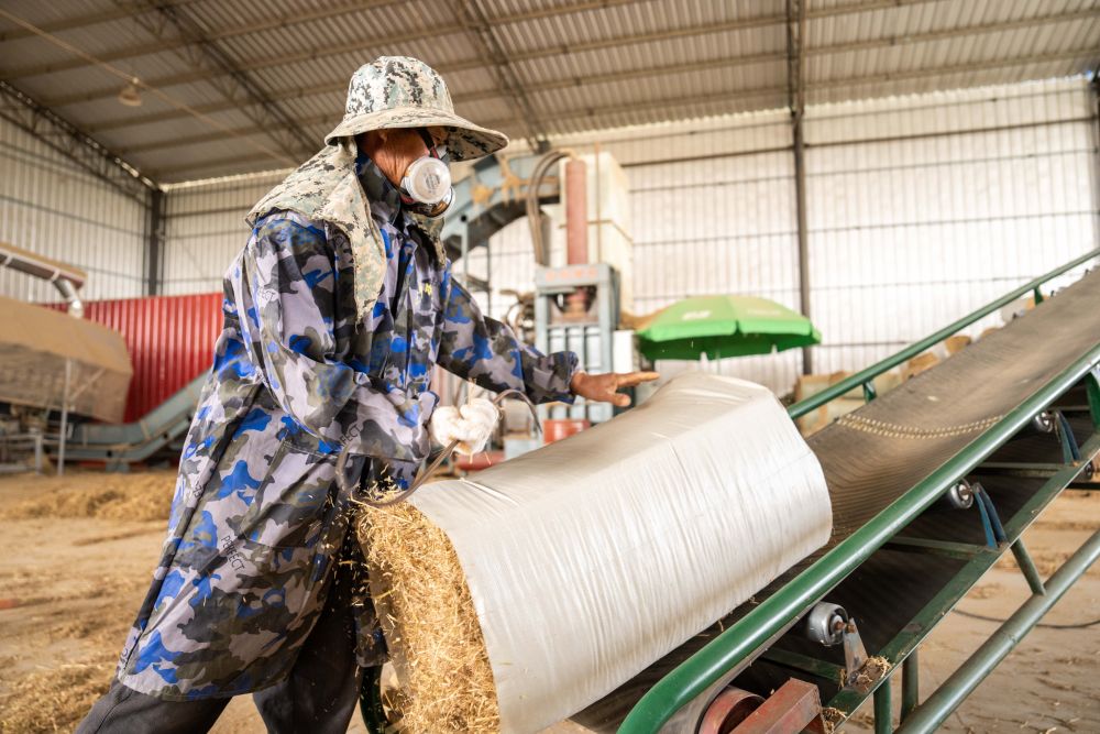 ↑湖南省益陽(yáng)市南縣武圣宮鎮(zhèn)沿河堤村,工人把打捆好的秸稈放置在傳送帶上(11月25日攝)。