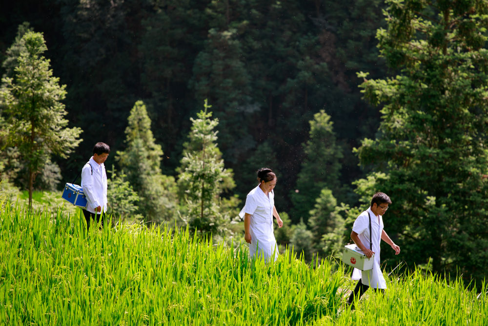 ↑貴州省黔東南苗族侗族自治州榕江縣忠誠(chéng)鎮(zhèn),村醫(yī)吳昌喜(左)、吳濤(右)、項(xiàng)昌會(huì)走在榕江縣忠誠(chéng)鎮(zhèn)定弄村郊外的田埂上(8月16日攝)。吳昌喜和兒子吳濤、兒媳項(xiàng)昌會(huì)都是村醫(yī),呵護(hù)著三個(gè)村820多戶、3660多名群眾的健康。