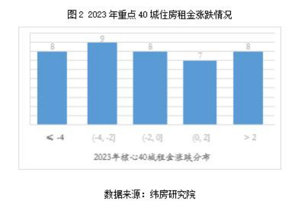 從漲跌結(jié)構(gòu)看,緯房研究院數(shù)據(jù)顯示,2023年重點(diǎn)40城中有15個(gè)城市住房租金同比上漲,其余25個(gè)城市住房租金同比下降。住房租金上漲的城市中,7個(gè)城市漲幅在2%以內(nèi),8個(gè)城市漲幅超過(guò)2%;住房租金下跌的城市中,8個(gè)城市跌幅在2%以內(nèi),9個(gè)城市跌幅在2-4%;8個(gè)城市跌幅超過(guò)4%。