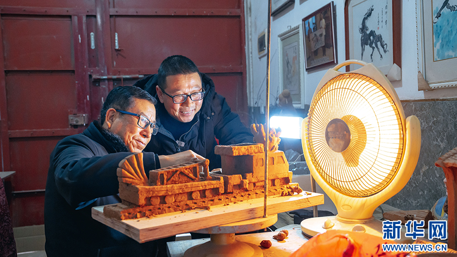 在工作室,師父黃忠詳指導(dǎo)劉建強(右)精雕泥塑“龍頭軌道車”。劉一江 攝