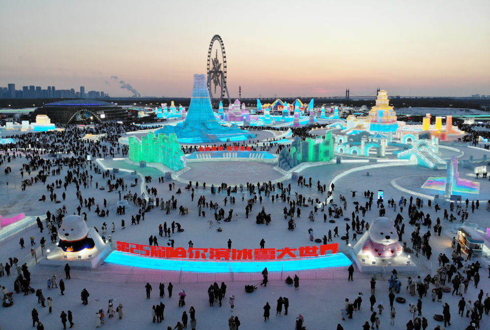 2024年2月15日,游客在哈爾濱冰雪大世界園區(qū)內(nèi)游玩(無(wú)人機(jī)照片)。新華社記者 王建威 攝