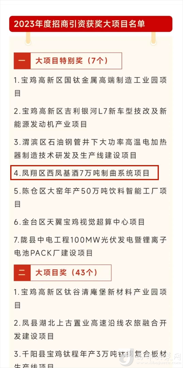 西部決策網(wǎng)訊(記者劉玉 韓宗憲)近日,寶雞市召開深化“三個年”活動暨招商引資推進會,會上通報表彰了2023年度招商引資和項目建設等重點工作,鳳翔區(qū)西鳳基酒7萬噸制曲系統(tǒng)項目榮獲招商引資大項目特別獎,柳林鎮(zhèn)黨委副書記、鎮(zhèn)長劉永強獲招商引資突出貢獻個人獎。