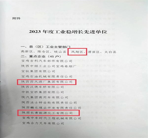 西部決策網(wǎng)訊(記者劉玉 韓宗憲)3月10日,在寶雞市工業(yè)和信息化工作會(huì)議上,鳳翔區(qū)被評(píng)為全市“2023年度工業(yè)穩(wěn)增長(zhǎng)先進(jìn)單位”;陜西西鳳酒廠集團(tuán)有限公司、陜西長(zhǎng)青能源化工有限公司、陜西柳林酒業(yè)集團(tuán)有限公司3戶被評(píng)為工業(yè)穩(wěn)增長(zhǎng)先進(jìn)企業(yè)。