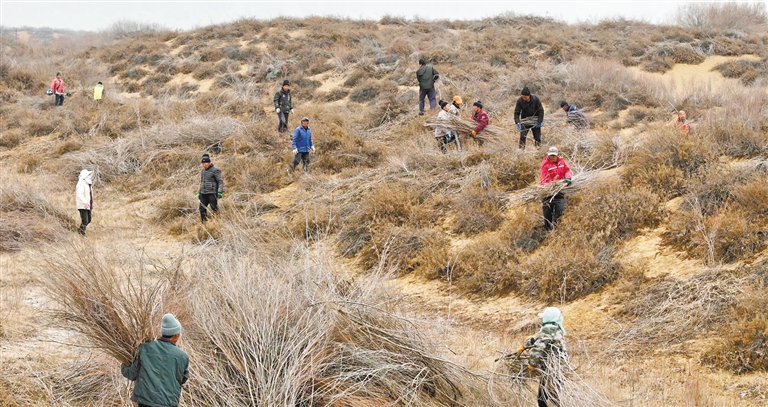 3月5日,在榆林市榆陽區(qū)小壕兔鄉(xiāng)掌高兔村,技術(shù)人員在進(jìn)行沙柳平茬作業(yè)。