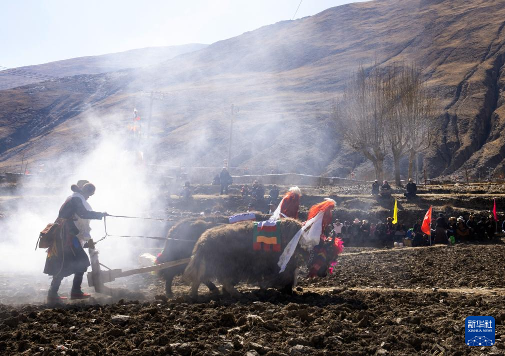 離村莊不遠(yuǎn)的一處農(nóng)田上,在百余名村民的注視下,12名壯年男子哼唱著古老的曲調(diào),驅(qū)趕耕牛耕出新年的第一犁。“農(nóng)業(yè)生產(chǎn)早就實(shí)現(xiàn)了機(jī)械化,之所以用傳統(tǒng)的‘二牛抬杠’來舉行開耕儀式,是為了更好地傳承高原農(nóng)耕文化。”加麻村委員會(huì)主任土旦說。