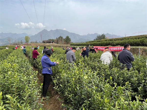 山間云霧繞,茶園綠意濃。在采摘場內(nèi),千畝茶園新芽吐露,一排排整齊的茶樹如同“綠毯”鋪滿了漫山遍野,縣茶技站專家對采摘技術(shù)進(jìn)行了現(xiàn)場培訓(xùn),采茶工人熟練地采摘著新茶,豐收的喜悅洋溢在她們的臉上,時時回蕩著不一樣的“茶語花香”。