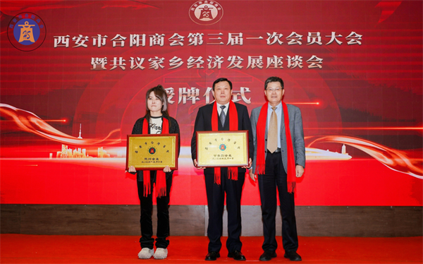 西安市合陽(yáng)商會(huì)會(huì)長(zhǎng)賈申龍先生和監(jiān)事長(zhǎng)劉自力先生為副會(huì)長(zhǎng)單位授牌。